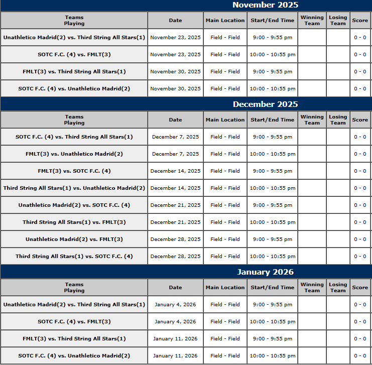** NOTE: ALL 9pm scheduled games will begin after the 8pm game is complete. There will be an allowed warmup time. Games will not start at exactly 9pm.