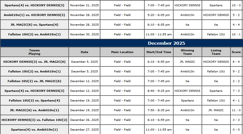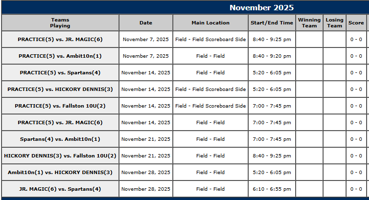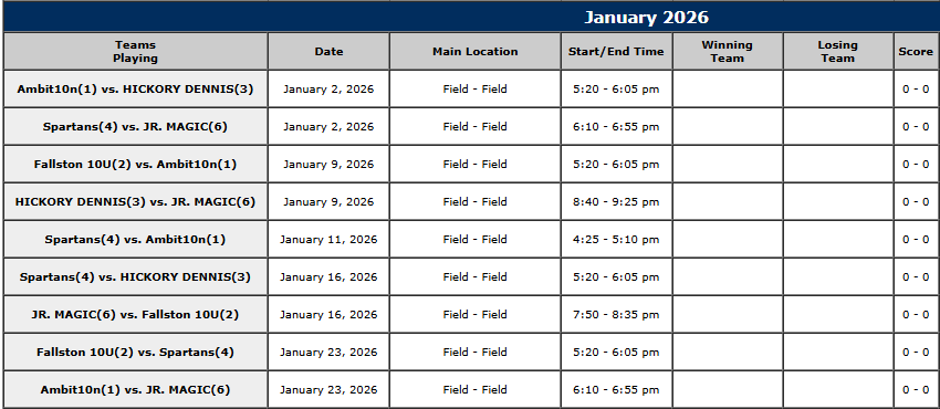 BOYS 10U CLUB 2025 – 2026 WINTER 1 SCHEDULE