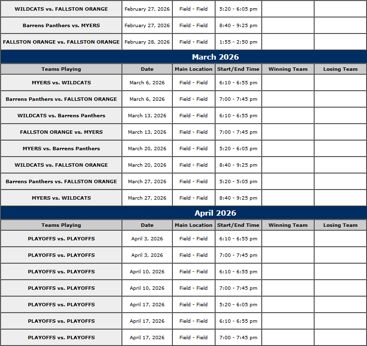 NOT SET BELOW = PLAYOFFS Championship TBA Top 4 Teams make it.