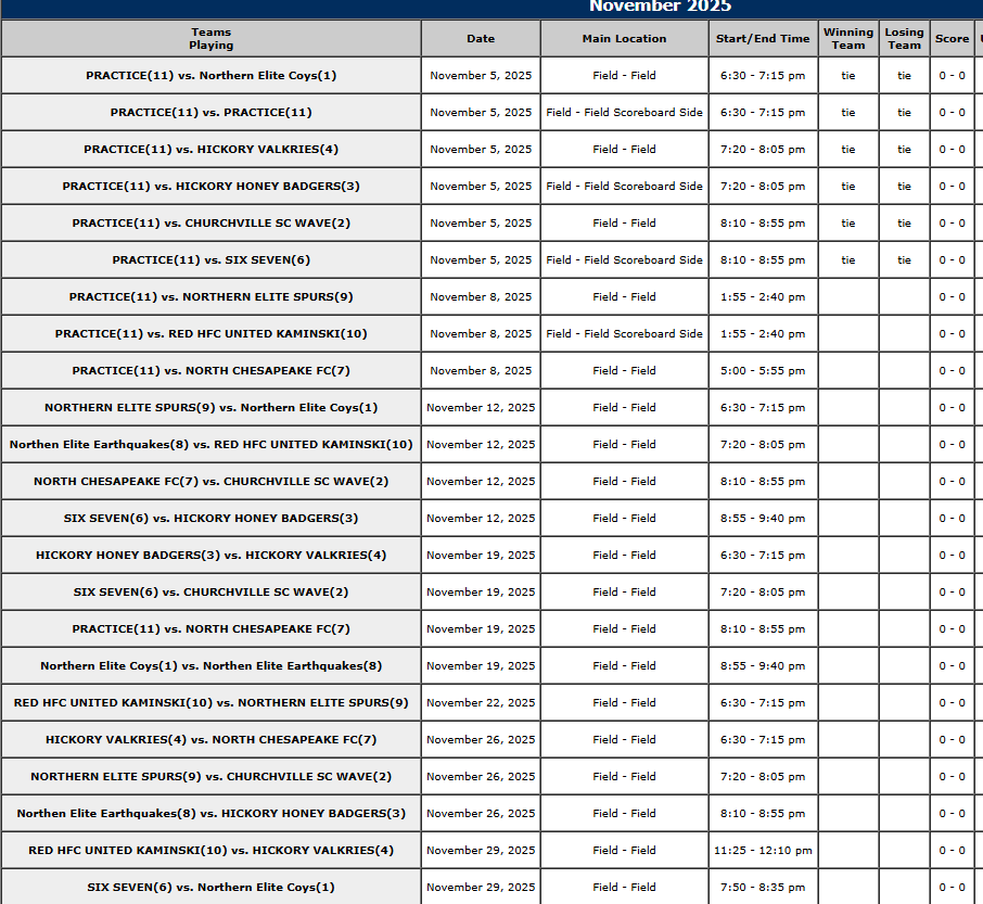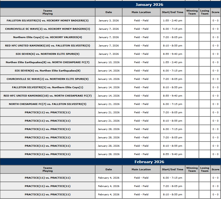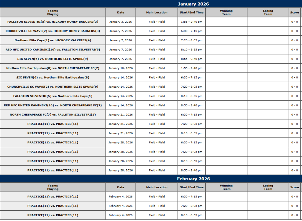 Girls 13U CLUB Battle Ground Schedule November 22, 2023 | No Comments | Uncategorized PRACTICE IN JANUARY = PLAYOFF DATES GIRLS 13U CLUB 2025 – 2026 WINTER 1 SCHEDULE COACH SHYLANDSKI 13U GIRLS WINTER CHAMPIONS NOT SET = PLAYOFF DATES