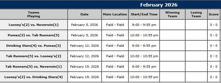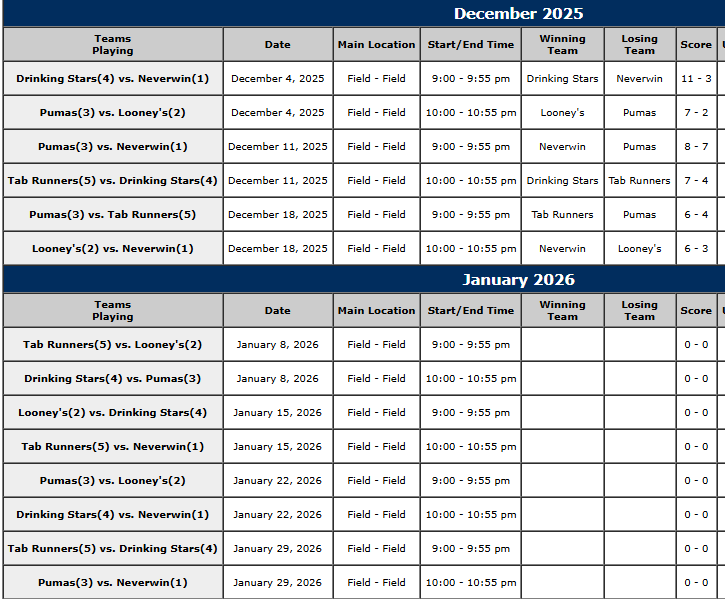 MEN’S OVER 30 SOCCER SCHEDULE June 10, 2023 | No Comments | Schedules WINTER MEN’S OVER 30 2025 SCHEDULE